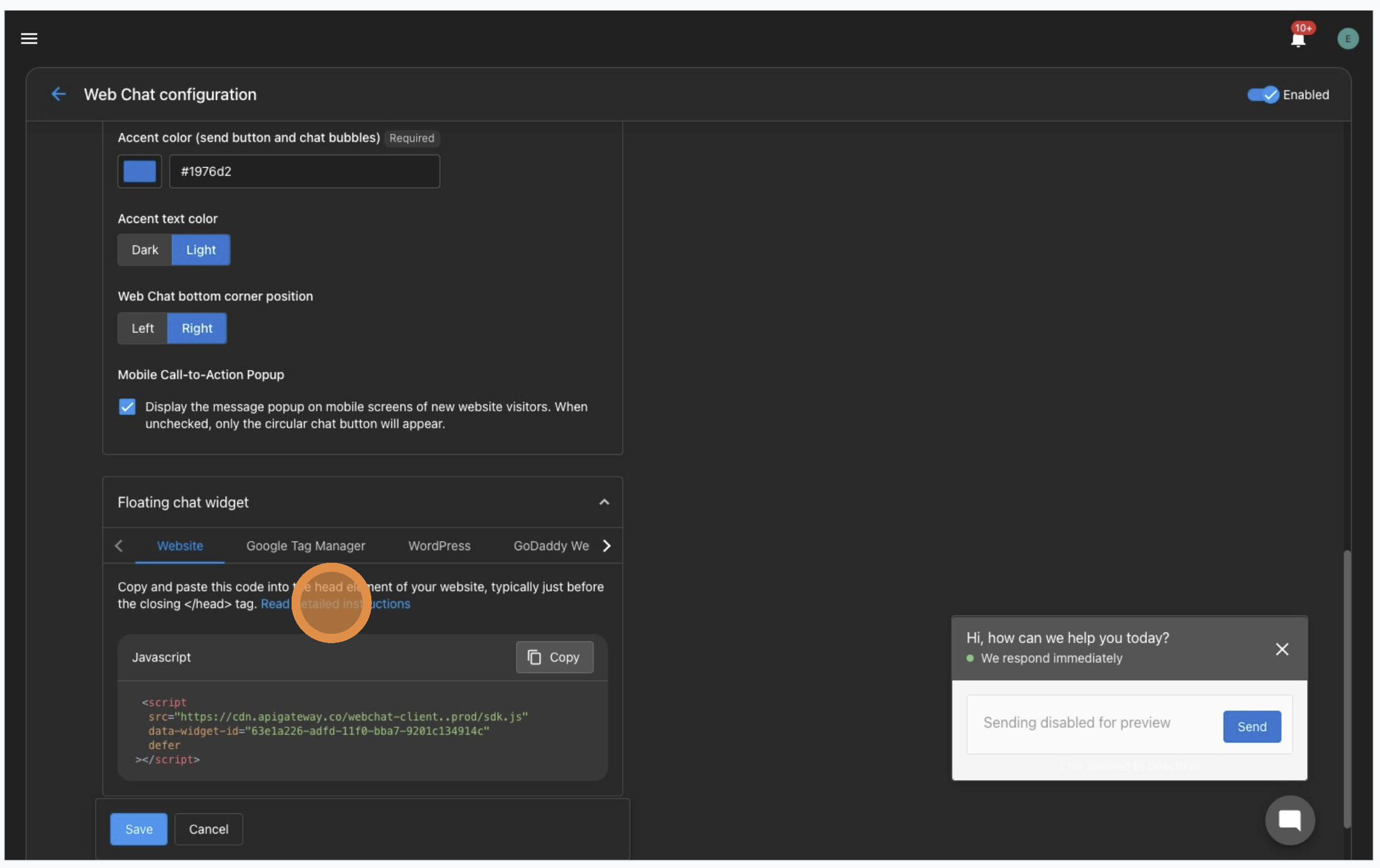 - Scroll down to the bottom of the page to the "Floating Chatbot Widget" section. There, you can find the correct code based on who hosts/manages your website content. For example, WordPress, GoDaddy, or even a snippet to add to your Google Tag Manager! Once you have found one that best works for you, click Copy.